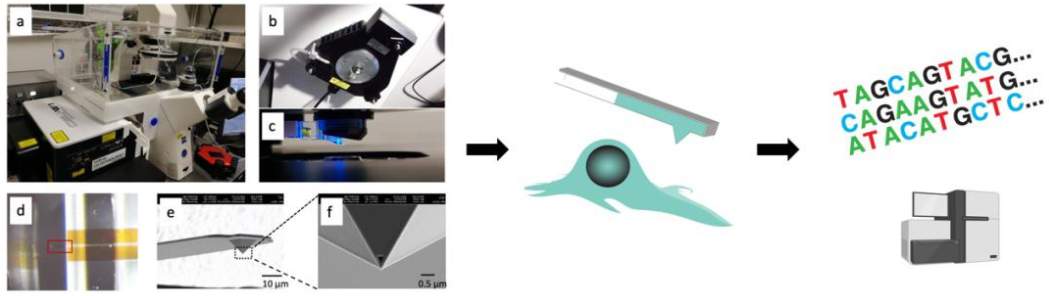 當然,如此精細的操作肯定需要更加精密、分辨率更高的儀器來進行。陳萬澤剛開始嘗試利用在細胞領域相對比較小眾的原子力顯微鏡來逐漸優(yōu)化自己的想法。原子力顯微鏡有一個很尖的硅探針,用于探測物質(zhì)表面性質(zhì)。陳萬澤團隊對這個探針進行了一系列的改造,包括表面活化、修飾等等,讓探針能夠在扎入細胞質(zhì)的同時吸附出胞質(zhì)內(nèi)的RNA。但是改造的成本和探針成本都比較高,且成功率在當時還比較低。