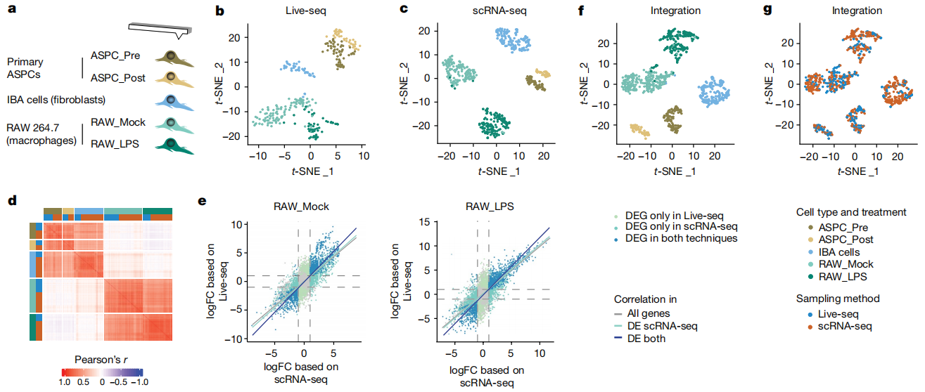 之后在了解到瑞士洛桑聯(lián)邦理工學院研發(fā)了一種可以吸出部分胞質(zhì)的特殊的原子力顯微鏡(FluidFM,原子力顯微鏡與微控流技術的結(jié)合),兩個團隊順理成章的開始聯(lián)合攻關。最終完成Live-seq的改造,對五種類型共295個細胞進行了測序,發(fā)現(xiàn)Live-seq能夠有效區(qū)分不同類型的細胞,且平均每個細胞能檢測到約4112個基因的表達信息。文章中所用的細胞包括IBA(神經(jīng)膠質(zhì)細胞)、ASPCs(原代小鼠脂肪干細胞和祖細胞)、RAW264.7(單核細胞或巨噬細胞樣細胞系)、RAW-G9(紅色熒光標記的Tnf啟動子,便于下游功能分析)。