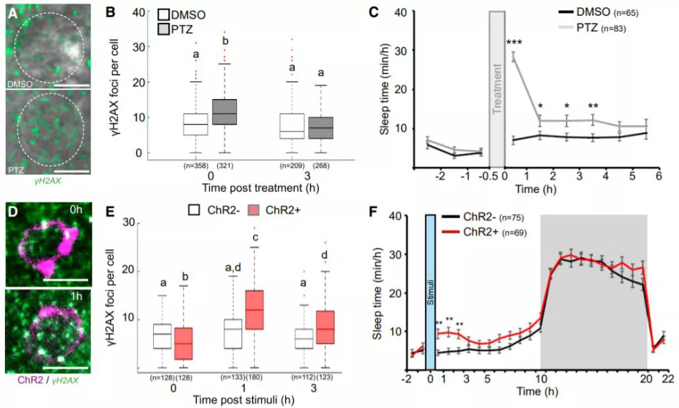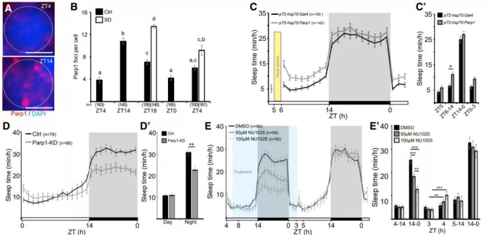實(shí)驗(yàn)表明,在某個(gè)時(shí)刻DNA損傷的積累達(dá)到了最大閾值,并且睡眠壓力增加到一定程度,以至于觸發(fā)了睡眠的沖動,魚就會進(jìn)入睡眠狀態(tài)。隨后的睡眠促進(jìn)了DNA修復(fù),從而減少了DNA損傷。 隨后,研究人員進(jìn)一步探究了DNA損傷修復(fù)過程中存在重要意義的PARP1蛋白的潛在作用模式。PARP1 標(biāo)記細(xì)胞中的 DNA 損傷位點(diǎn),并招募所有相關(guān)系統(tǒng)清除 DNA 損傷。根據(jù) DNA 損傷,清醒時(shí) PARP1 在 DNA 斷裂位點(diǎn)的聚集增加,在睡眠時(shí)減少。通過遺傳和藥理學(xué)操作,PARP1 的過表達(dá)和敲低表明,增加 PARP1 不僅可以促進(jìn)睡眠,還可以增加睡眠依賴性修復(fù)。相反,PARP1 的抑制阻斷了 DNA 損傷修復(fù)的信號。有趣的是,魚沒有完全意識到自己累了,并沒有睡覺,也沒有進(jìn)行 DNA 損傷修復(fù)。