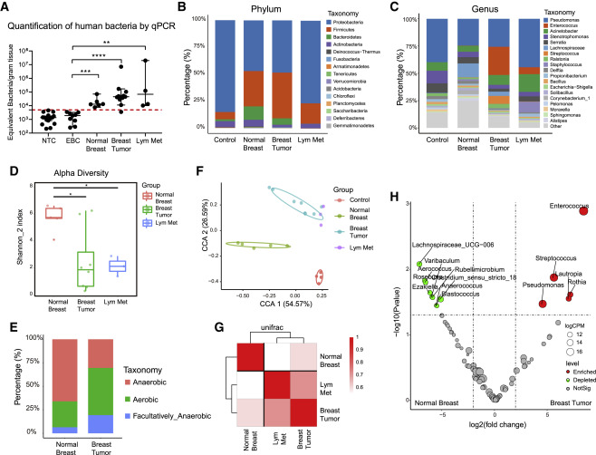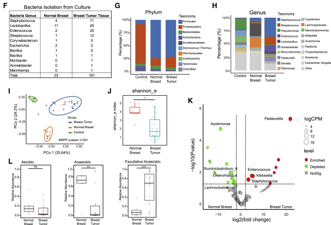 自發(fā)小鼠BT含有大量的活細(xì)菌研究人員通過(guò)16S測(cè)序全面描述組織駐留菌群的組成。對(duì)16S文庫(kù)構(gòu)建流程進(jìn)行了優(yōu)化,通過(guò)添加生物素富集步驟來(lái)減少非特異性基因組序列,比傳統(tǒng)方法檢測(cè)腸道菌群的靈敏度顯著提高。據(jù)此,研究分析了正常組織和腫瘤組織中的微生物群(圖1)。無(wú)監(jiān)督聚類分析顯示,對(duì)照(NTC和EBC)、正常乳腺組織和BT組織具有明顯的微生物群落(圖1I)。陰性對(duì)照樣品中大部分微生物為變形菌門(mén)(Proteobacteria,圖1G和S1I),而組織樣品富集為厚壁菌門(mén)(Firmicutes,圖1G)。研究數(shù)據(jù)共同表明PyMT自發(fā)性腫瘤中含有大量的活菌。