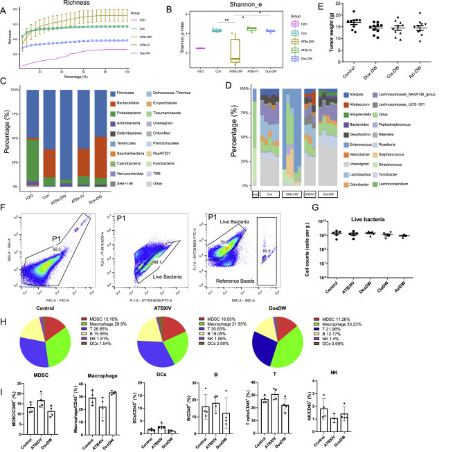 清除腫瘤內(nèi)的微生物會(huì)阻礙腫瘤的轉(zhuǎn)移,但不會(huì)阻礙原發(fā)腫瘤的生長(zhǎng)通過(guò)測(cè)試不同的抗生素組合和給藥途徑來(lái)選擇性地消除腫瘤駐留或腸道微生物群(圖3A)。研究發(fā)現(xiàn)使用雞尾酒抗生素(ATBx),通過(guò)飲用水(DW)可以有效清除腸道和腫瘤微生物菌群。當(dāng)ATBx經(jīng)尾靜脈靜脈注射時(shí),腫瘤菌群被清除,而腸道菌群保持完整(圖3B和3C)。通過(guò)DW給藥穿透細(xì)胞膜的抗生素多西環(huán)素具有與ATBx-IV相似的效果(圖3B和3C)。最重要的是,ATBx-IV和Dox-DW處理在腸道活菌數(shù)量、腸道微生物群譜和腫瘤免疫譜方面與對(duì)照組保持相當(dāng)(圖S3A S3D和S3F S3I)。結(jié)果發(fā)現(xiàn)ATBx-DW能有效地減緩自發(fā)MMTV-PyMT BTs的腫瘤生長(zhǎng)(總腫瘤重量為15±對(duì)照組為0.5g,而ATBx-DW為11±0.8g),而單獨(dú)用ATBx-IV或Dox-DW消除腫瘤微生物群并不影響腫瘤總重量(圖3D)。這表明腸道菌群在腫瘤生長(zhǎng)中起著重要作用,而腫瘤菌群則不然。