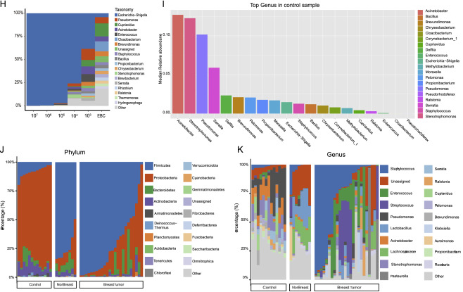 圖S1。在門(mén)和屬水平上優(yōu)化EBC對(duì)照組、正常乳腺和乳腺腫瘤組織常駐菌群分析及菌群相對(duì)豐度,與圖1和STAR方法相關(guān)