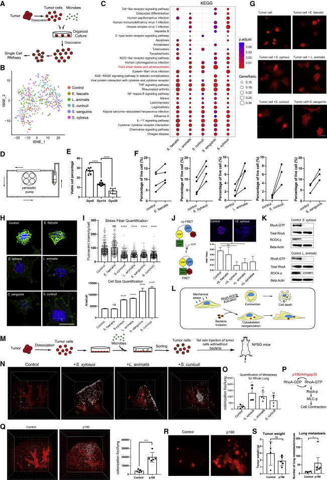 研究對(duì)從類器官培養(yǎng)中分離的細(xì)菌入侵癌細(xì)胞進(jìn)行單細(xì)胞RNAseq分析(圖6A)。 KEGG通路分析顯示,被細(xì)菌入侵的腫瘤細(xì)胞開(kāi)啟了許多免疫相關(guān)信號(hào),包括toll樣受體信號(hào)通路、nod樣受體信號(hào)通路、TNF信號(hào)通路、NF-κB信號(hào)通路、Th17信號(hào)通路、細(xì)胞因子趨化因子相關(guān)通路等(圖6C)。有趣的是,研究發(fā)現(xiàn)木糖擬南芥、動(dòng)物擬南芥、兔丘擬南芥和馬血擬南芥對(duì)腫瘤細(xì)胞的侵襲特異性地觸發(fā)了流體剪切應(yīng)力途徑。